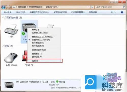 2.右键选择要查看的打印机设备,选择“属性”菜单;