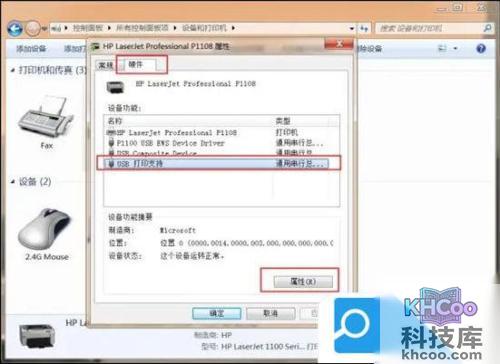 3.点击顶部“硬件”选项卡,选中要查看的设备功能项,点击“属性”按钮;