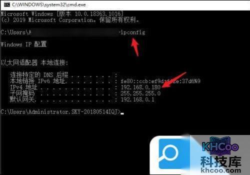 10. 在跳转的页面输入“ipconfig”,查看“ipv4地址”数字并记录;