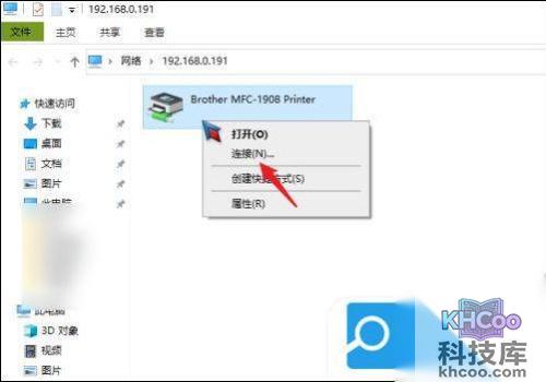 12. 这时候被共享的打印机就出现了。右键点开打印机图标,选择“连接”;