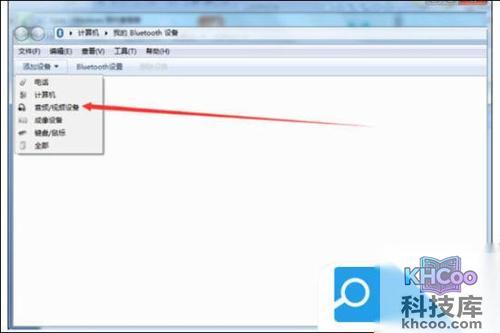 5. 插入蓝牙适配器,打开我的电脑,在我的左上角点击“添加设备”。在弹出的窗口中,点击添加“设备-音频/视频设备”。
