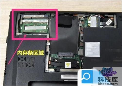 3. 打开笔记本后盖,T型区域左上角就是添加内存条的地方;