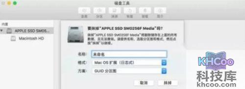 4、点按「格式」弹出式菜单,选取「MacOS扩展」,输入名称,然后点按[抹掉」
