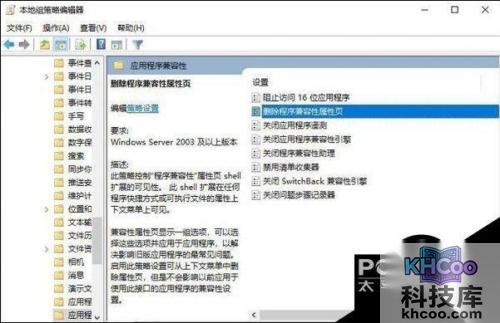 2. 进入到组策略编辑器界面后,依次点击左侧栏中的“计算机配置——-管理模板——Windows组件——应用程序兼容性”,然后双击打开右侧中的“删除程序兼容性属性页”。