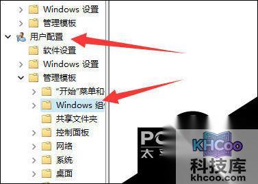 3. 然后进入左边用户配置下的“Windows组件”(如图所示)。