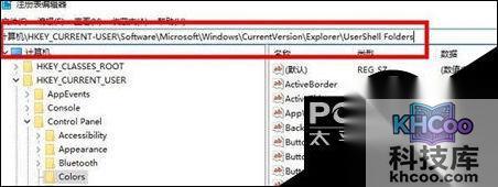 2. 进入到 注册表 编辑器界面后,将“HKEY_CURRENT-USERSoftwareMicrosoftWindowsCurrentVersionExplorerUserShell Folders”复制粘贴到上方地址栏中,并回车定位到此。
