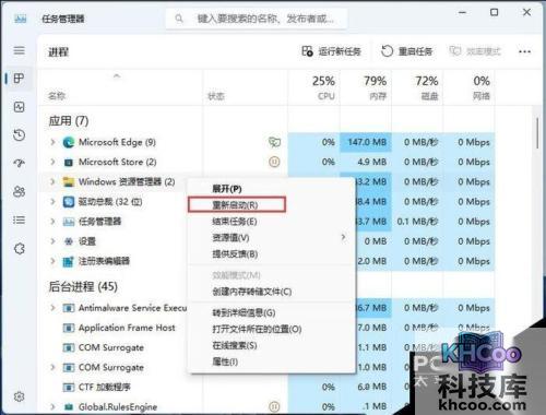 找到【 Windows 资源管理器】然后点击【 右键】,打开的菜单项中,选择【 重新启动】。