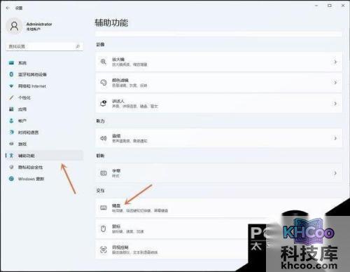 2. 进入到新的界面后,点击左侧栏中的“辅助功能”选项,随后点击右侧中的“键盘”。