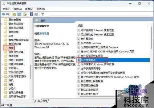 3. 本地组策略编辑器窗口,依次展开到【 计算机配置 -管理模板 -Windows 组件 -搜索】,在右侧面板中找到并双击【 允许搜索要点】策略。