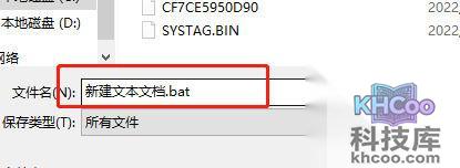 3、在名称后面加一个 .bat ,然后下方的文件类型选择为“所有文件”