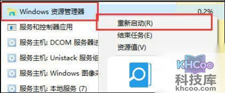 7、最后打开我们的任务管理器,找到其中的“资源管理器”,右键选择“重新启动”即可。