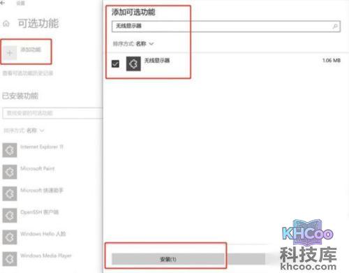 3、点击【 添加可选功能 】按钮,稍作等待后,将会出现一个搜索框,输入关键词【 无线显示器 】。