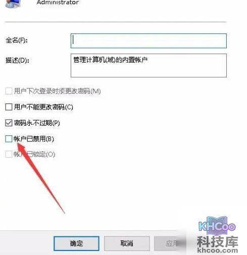 3、在随后弹出的属性窗口中,请您去除“ 帐户已停用 ”前的勾选标记,确认无误后,点击确定按钮即可完成操作。