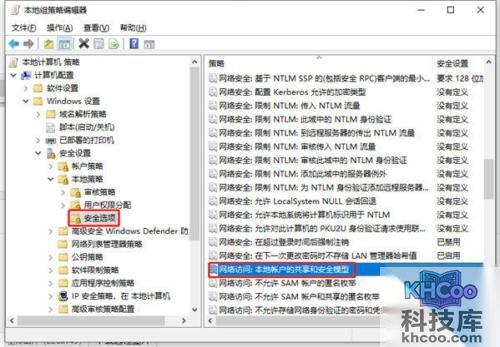 4、然后,选择" 本地策略 "的" 安全选项 "菜单项,并双击打开" 网络访问:本地账户的共享和安全模型 "项。