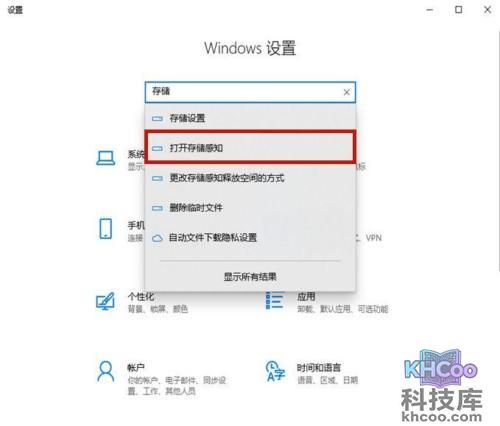 2、在设置功能界面中输入【 存储 】,并选择【 打开存储感知 】。