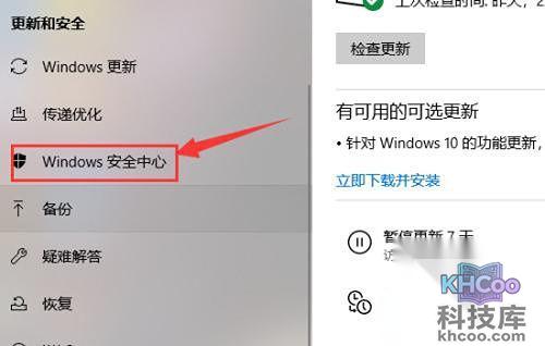 3、我们进入到更新和安全中以后,我们的左侧可以看到windows安全中心,并选择病毒和威胁防护的选项。
