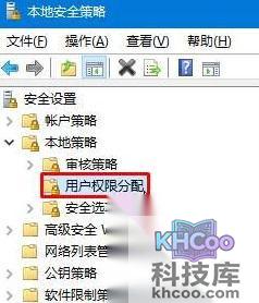 3、进入到此路径“ 本地安全策略 ”,在目录的左边部分点击“ 本地策略—用户权限分配 ”分支。