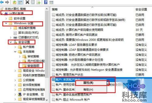 3、进入“ 组策略 ”编辑界面后,请您依次展开“计算机管理”-“Windows设置”-“安全设置”-“本地策略”-“安全选项”分支。在右侧部分,您将找到名罢嘶В豪幢稣嘶ё刺钡难∠睿⒔惺蟊暧壹拥龅挠壹说ブ醒≡瘛� 属性 ”选项。