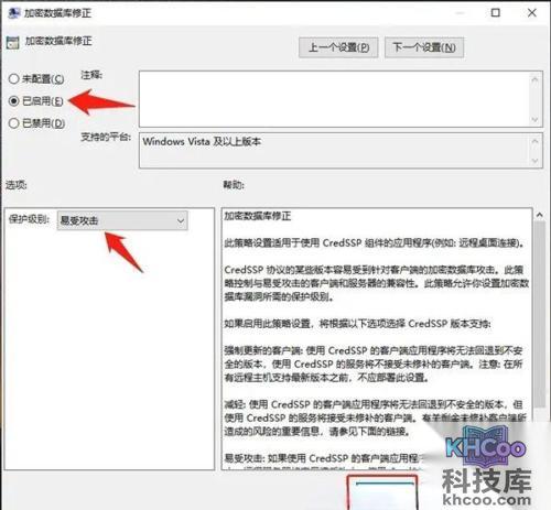 4、然后我们双击加密数据库修正,我们将其中的状态改为启用,然后将保护级别改为易受攻击,随即点击应用即可。