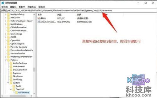 3、然后我们在注册表中找到这个路径:HKEY LOCAL MACHINE Software Microsoft Windows CurrentVersion Policies System\CredSSP Parameters