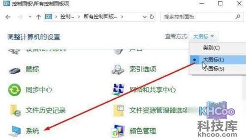2、在控制面板窗口中,将查看模式更改为【 大图标 】,在下方找到并点击打开【 系统 】选项卡。