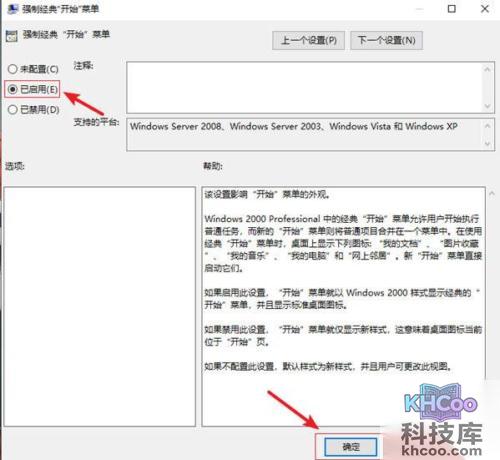 3、我们进入了强制经典开始菜单界面中,在上面选择已启用,然后我们点击下方的确定按钮即可。