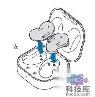 2、检查每个耳塞的方向,然后将其正确插入充电保护盒中的相应插槽。