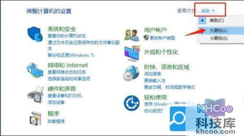 2、 进入控制面板后,在右侧类别按钮中点击选择“ 大图标 ”;