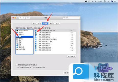 2、切换到快捷键选项,点击键盘,确保开启了打开或关闭键盘访问,使用Control+F1,可以锁定键盘与解锁键盘。