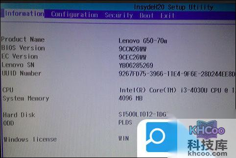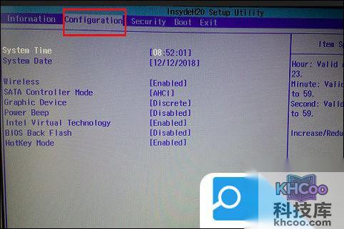 3、接着,在Bios下,使用键盘方向键,移动到“Configuration”选项卡;