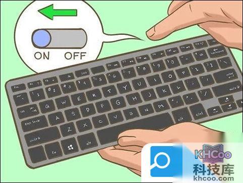 4、打开键盘。你必须先找到键盘开关。不同品牌的键盘,开关键的位置各不相同。你可以在键盘的底部、背面和侧面找到开关。