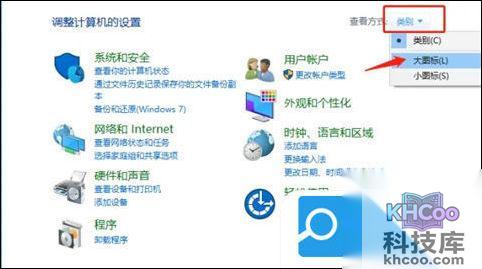 2、打开控制面板,在右侧“类别”按钮处选择“大图标”,如下图所示: