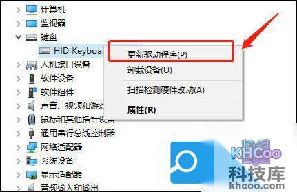 4. 右键键盘的驱动,选择更新驱动,等待驱动更新完成之后再试一试。
