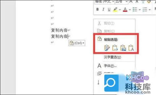 2. 然后鼠标定位到需要粘贴内容的位置后,按快捷键“Ctrl+V”就可以粘贴内容。也可以右击鼠标后,在粘贴选项中选择粘贴的样式粘贴内容。