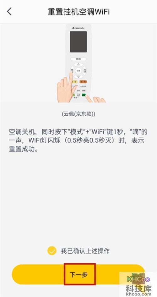 4、按提示重置 挂机 空调WiFi,完成后点击下一步。
