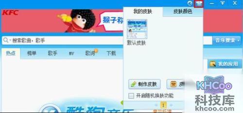 点击酷狗音乐播放器右侧上方形状像衣服一样的图标,就可以选择您喜欢的皮肤和颜色了。如(图1)