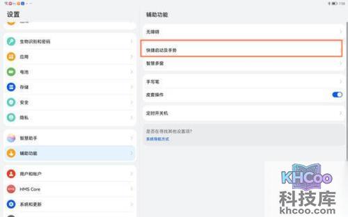 1、在 辅助 功能设置中点击【快捷启动及手势】。