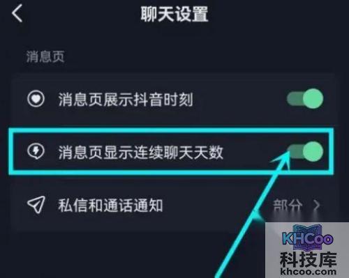 3、找到消息页显示连续聊天天数,打开右侧开关即可。