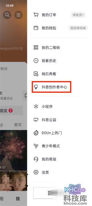 3、接着来到菜单的页面中可以查看到我的订单、我的钱包、我的二维码等功能,在这里我们要点击【抖音创作者中心】;