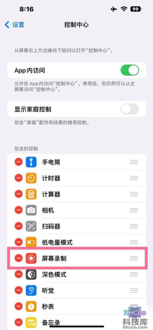 2、找到屏幕录制,点击加号添加。