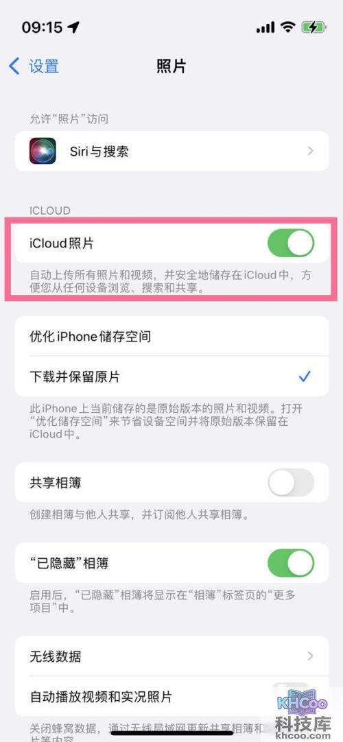 2、打开【iCloud照片】右侧的开关。