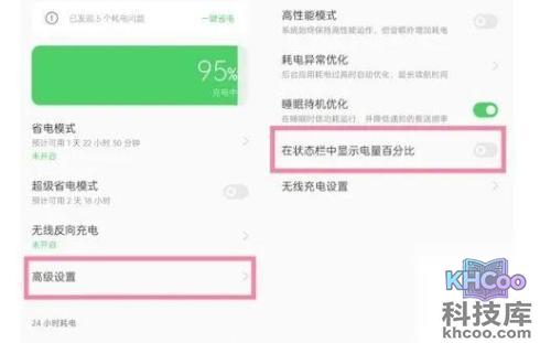 3、最后按下电池中的高级设置,开启时会在状态栏中显示电量百分比的按键后设置成功。