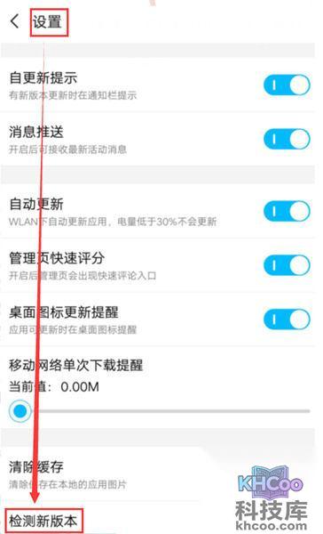 4、在设置界面中进行新版本检测。