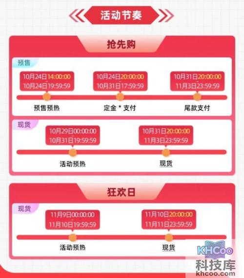第一波:“抢先购”阶段。预售活动将于10月24日开始,而定金支付截止时间为10月31日17:59:59。尾款支付则截止到11月3日23:59:59。在10月29日开始的现货预热期间,消费者可以感受到购物的热潮。