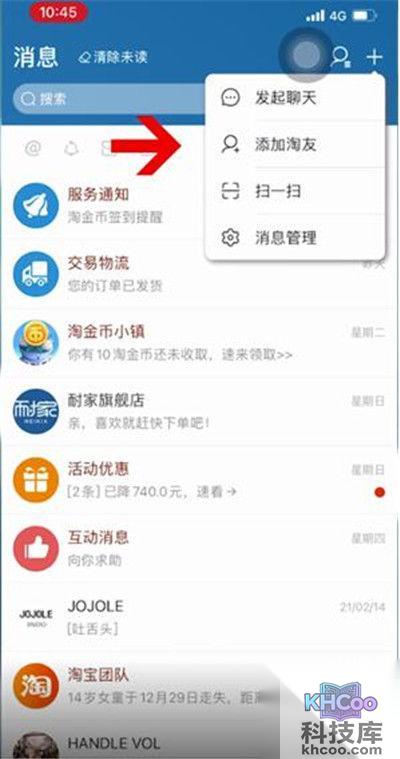 在消息页面的右上方大家可以看到一个加号我们点击这个加号会出现几个选项,添加淘友就在其中。