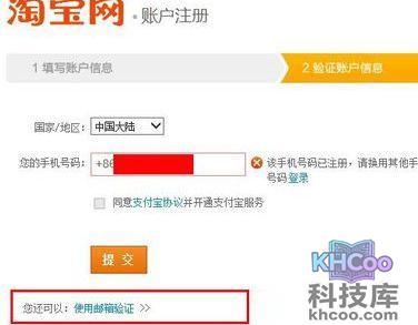 1、淘宝账号注册的时候,账号填写完毕,到填完电话号码的步骤时,出现已经被手机号码被占用的提示,直接选择页面下面的提示,使用 邮箱 认证;