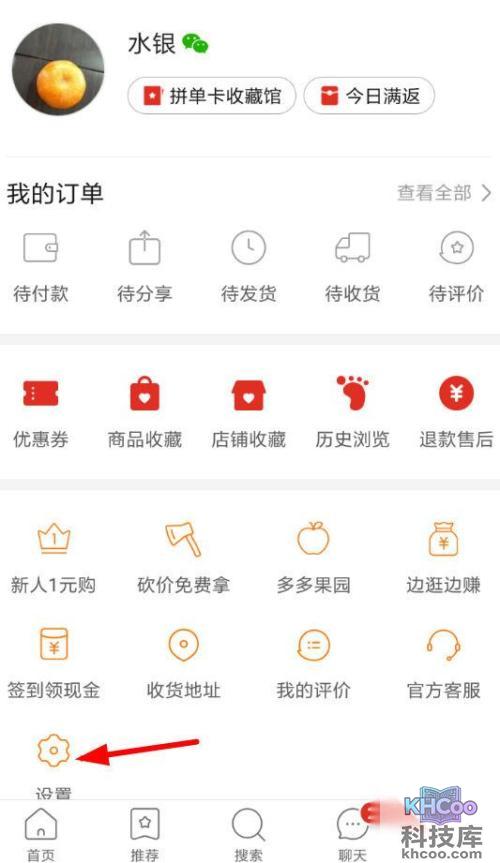 1、大家要想给拼多多设置免密码支付,那就需要先点击右下角进入个人中心,并且从下方的列表里选择“设置”功能进行操作。