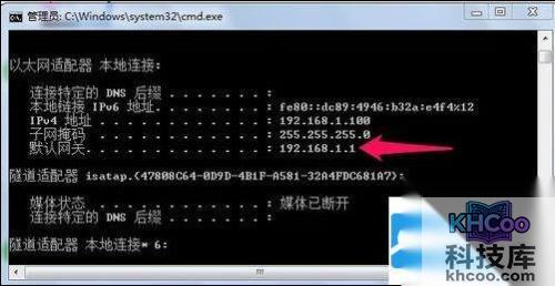 在命令提示符窗口中输入命令ipconfig,然后回车!