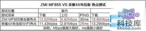 测试结果,ZMI MF855路由热点,在室内的下载和上传分别是12.62Mbps、6.82Mbps,PING延迟36ms;室外的下载和上传分别是18.80Mbps、19.87Mbps,PING延迟39ms。荣耀4X电信版Wi-Fi热点,室内的下载11.43Mbps,上传2.81Mbps,PING延迟25ms;室外的下载13.29Mbps,上传8.18Mbps,PING延迟24ms。