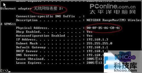 上图00:0F:B5:A6:C0:41为本网卡的MAC地址,如果是NETGEAR的无线网卡,在网卡的背面也有显示MAC地址的。